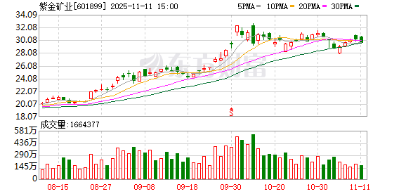 紫金矿业11月11日大宗交易平台出现一笔成交,成交量360.00万股,成交金额1.07亿元,大宗交易成交价为29.62元。该笔交易的买方营业部为华泰证券股份有限公司总部,卖方营业部为机构专用。